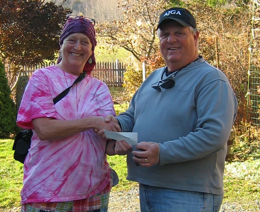 Bill Cherico presents a check from the Knights of Columbus of the Church of the Annunciation in Ludlow to Elaine Gambone for the Plymouth Memory Tree Community Fund