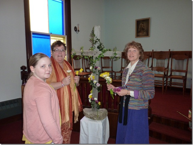 L – R Maddie Dean, Denise Dean, & Linda Hastings in process of decorating the cross