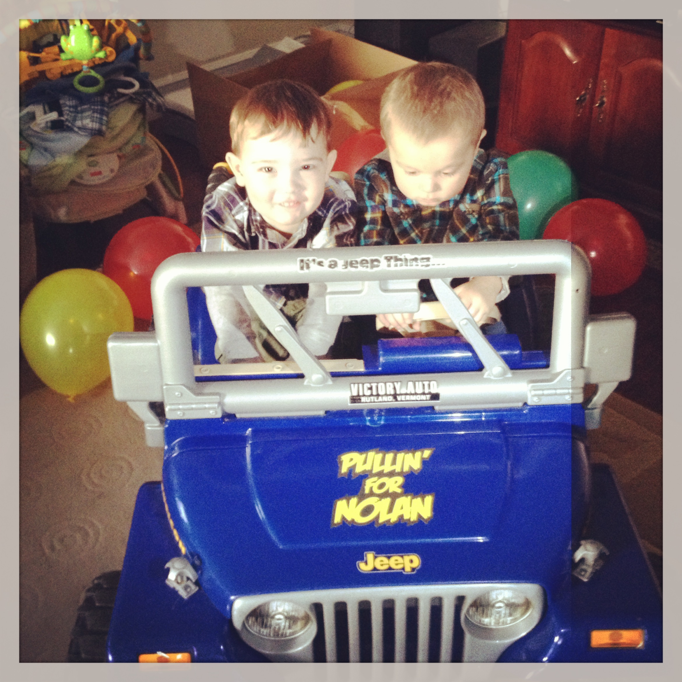 I neglected to include this picture of 2 young boys who recently turned 2 & shared a ride at Nolan Alberti’s party. I would imagine that some of you recognize our Owen(L), less than a week younger the Nolan. So glad that Nolan has done so well with his treatments & can again enjoy playing with friends!