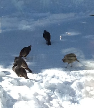 While we were away for a month, a flock of turkeys (is that the correct designation?) took up residence in our yard. A neighbor counted 40 one day when she came to fill our bird feeder! I don’t mind them visiting, but I will admit that they tend to dirty up the snow. Now that we are back, they seem less inclined to frequent our lawn. There is one exception, though – this lone turkey refuses to vacate our property. I am sure there is a way to tell the gender, but I have not pursued that so far. When I open the window, this turkey just ambles a few feet away, instead of scattering like the others have done in the past. At least the recent snow flurries have covered up some of the mess! I wonder if it is good fertilizer…..