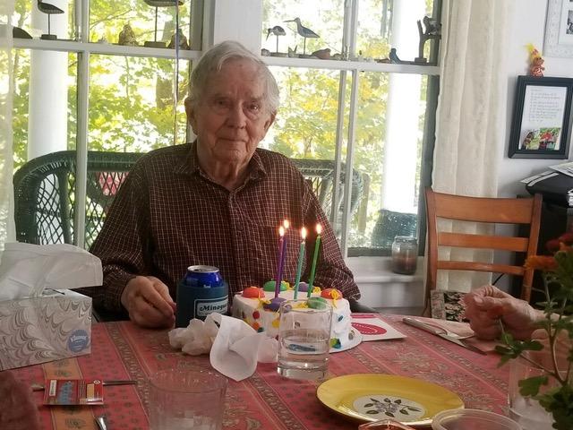 Sally and Dana Dolloff hosted a delightful early birthday party for Bill Jarvi (see picture), who will turn 94 on the 11th. He even had an extra serving of the ice cream cake! In attendance were daughter, Kristen Jarvi, Joan Day, as well as Tom and me.