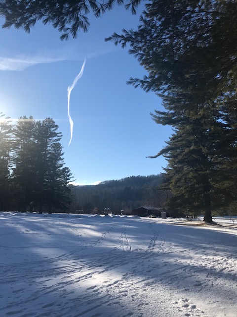 Karen Evans and I ventured over to Camp Plymouth State Park on Sunday afternoon to snowshoe. It was delightful. Although there was evidence of many recent visitors – walkers, cross country skiers, dogs and other creatures, there were only two other cars in the designed parking area. The snow was crunchy under the trees, but smooth out in the open. We noticed that a porta-potty has been placed near the concession building for the convenience of those enjoying the park.