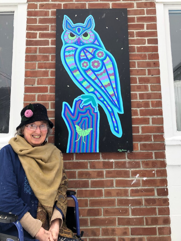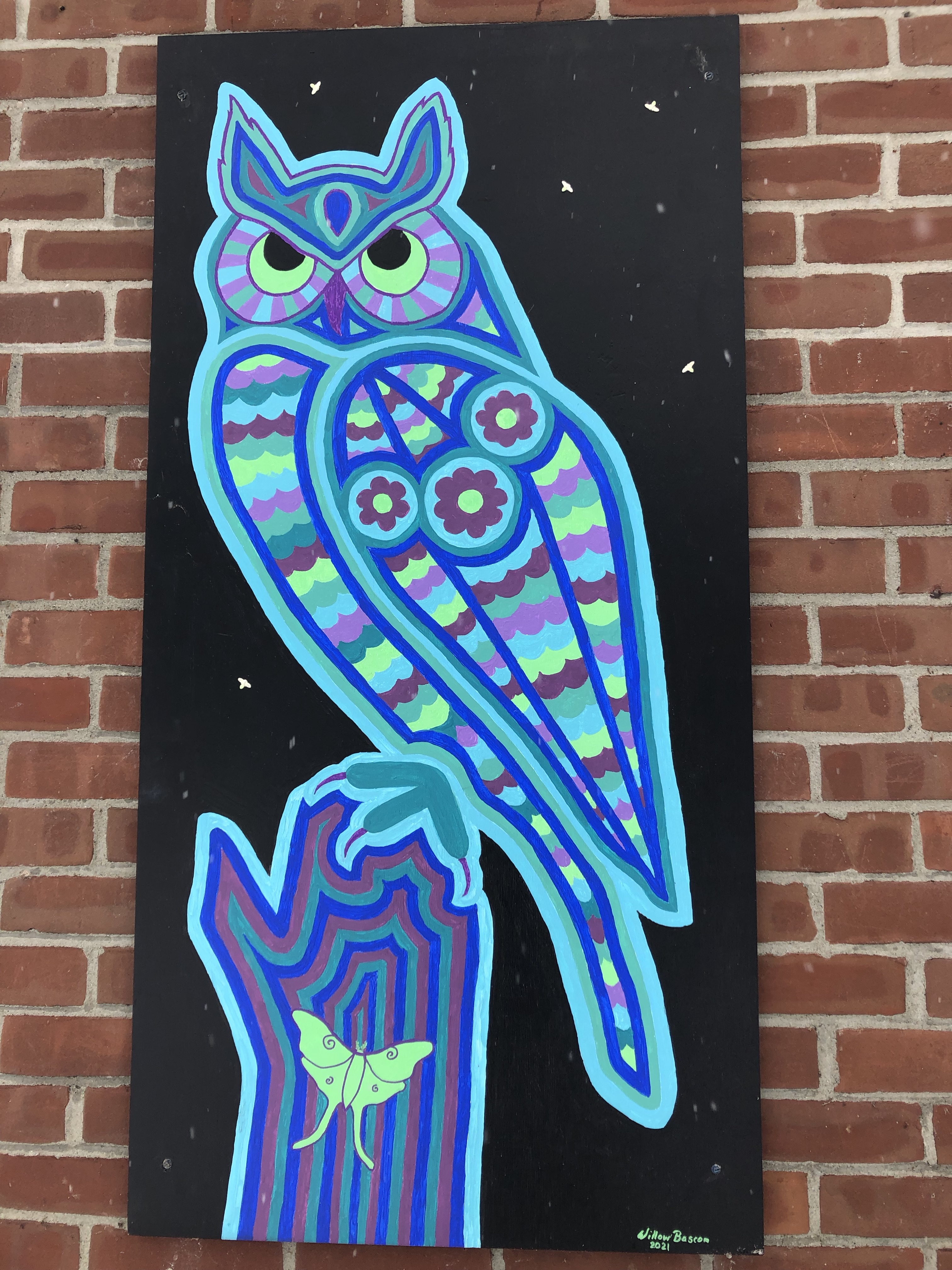 How nice to have this stunning new art by Willow Bascom, who donated her time, energy and talent to make this amazing owl for the front of the Plymouth Community Center. Learn more about Willow and see her work on her website: https://www.willowdraws.com. Many thanks to Matt Harootunian for installing it! Never fear, the old paintings formerly on the front of the Community Center will be relocated to the Town Hall, to preserve them and brighten up the walls.