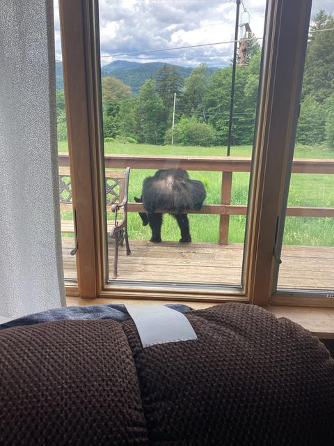 Please note that the bear population seems to be quite robust around our area this year. They seem to be constantly roaming about my yard and others have reported the same. The picture below shows the rear end of a bear contemplating jumping off Bob and Kathy Lynds’ deck.