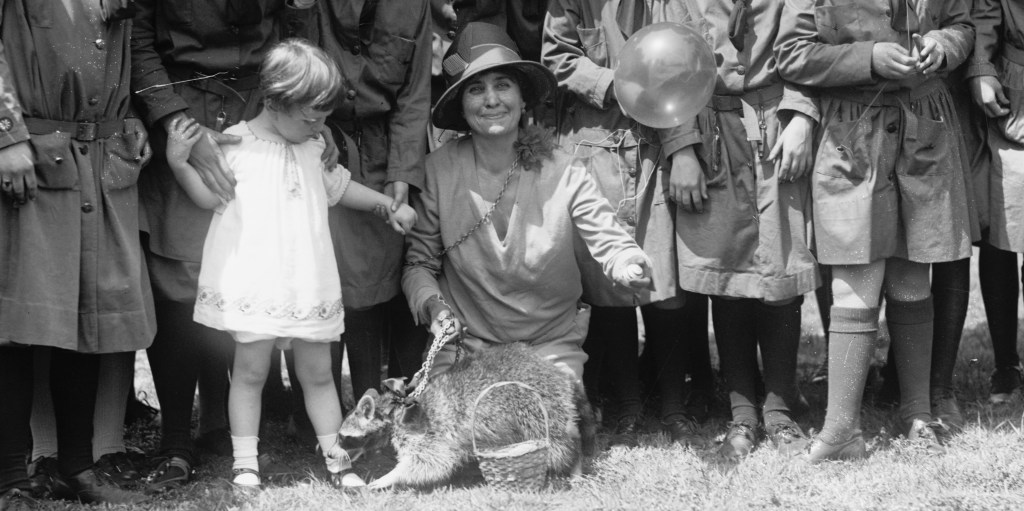 Coolidge pardoned this raccoon that was sent to the White House for Thanksgiving. The Coolidges kept her as a pet and named her Rebecca Raccoon. Photo courtesy of the Library of Congress.