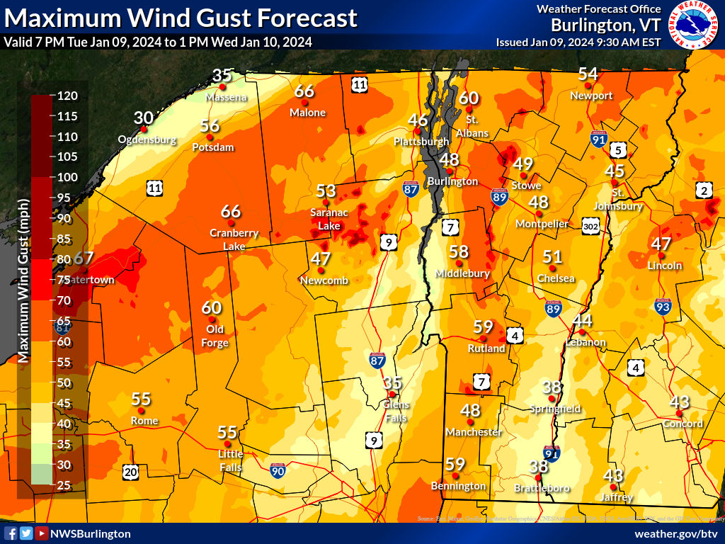 biggest impact will be widespread wind gusts in the 45 to 60 mph range with
