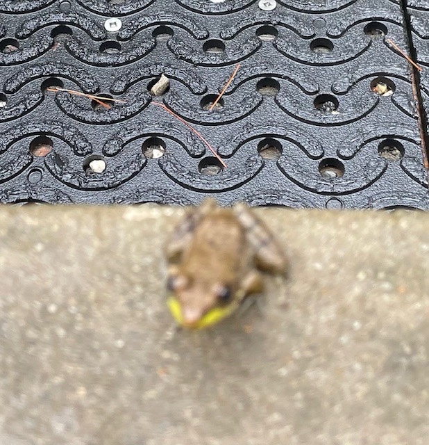 A day or so later, I went to clean out the drain in my entranceway to the basement. When I opened the lid, three tiny creatures were there. They look like frogs, but they could be toads. It is not an uncommon occurrence to find them outside the door waiting to hop in. Then I have to chase them around my laundry room and try to save them. They move pretty quickly, however, so sometimes I lose them under the refrigerator.